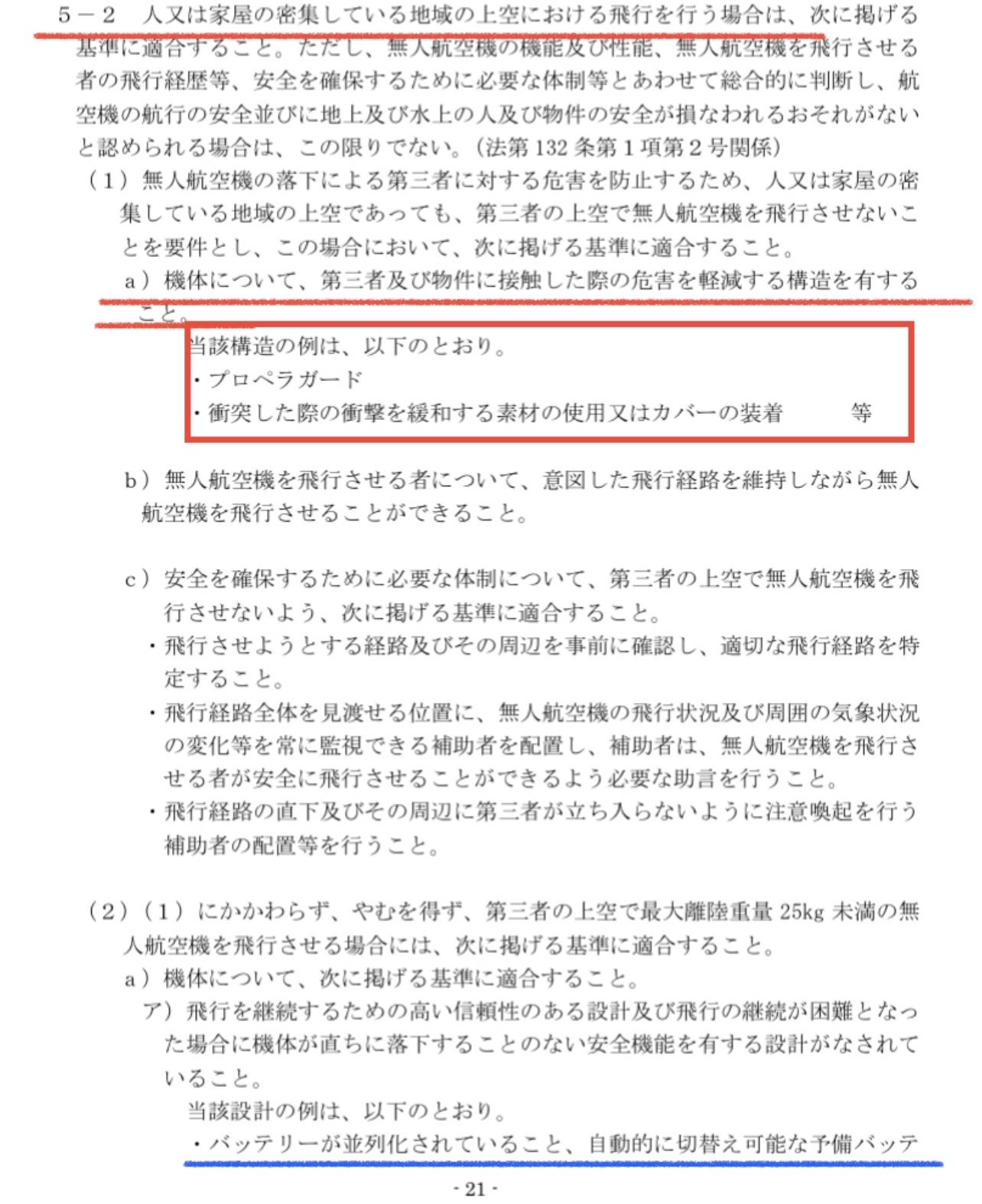 例えばP.21(1) a)機体について、第三者及び物件に接触した際の危害を軽減する構造を有すること。