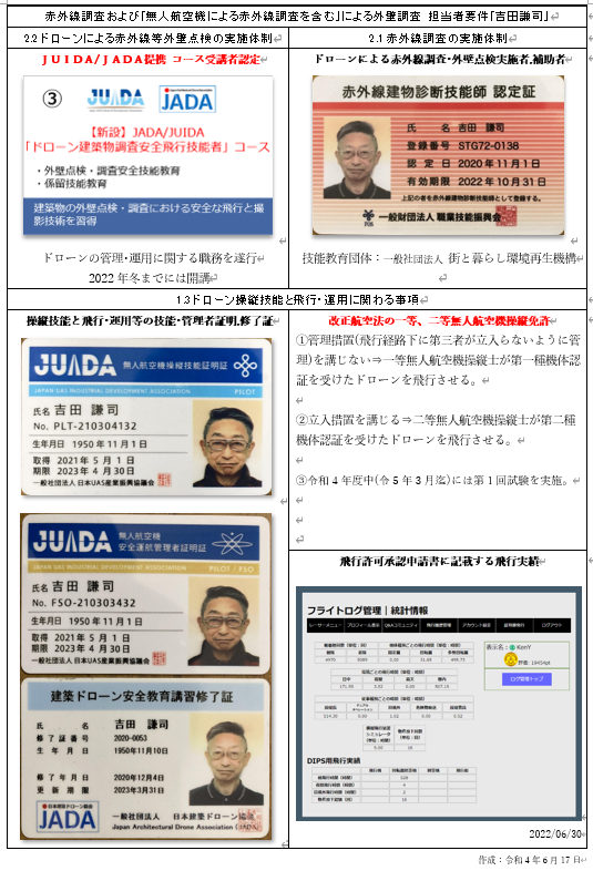 自己紹介書を添えましたのでご覧ください。以下の建築ドローン関係
