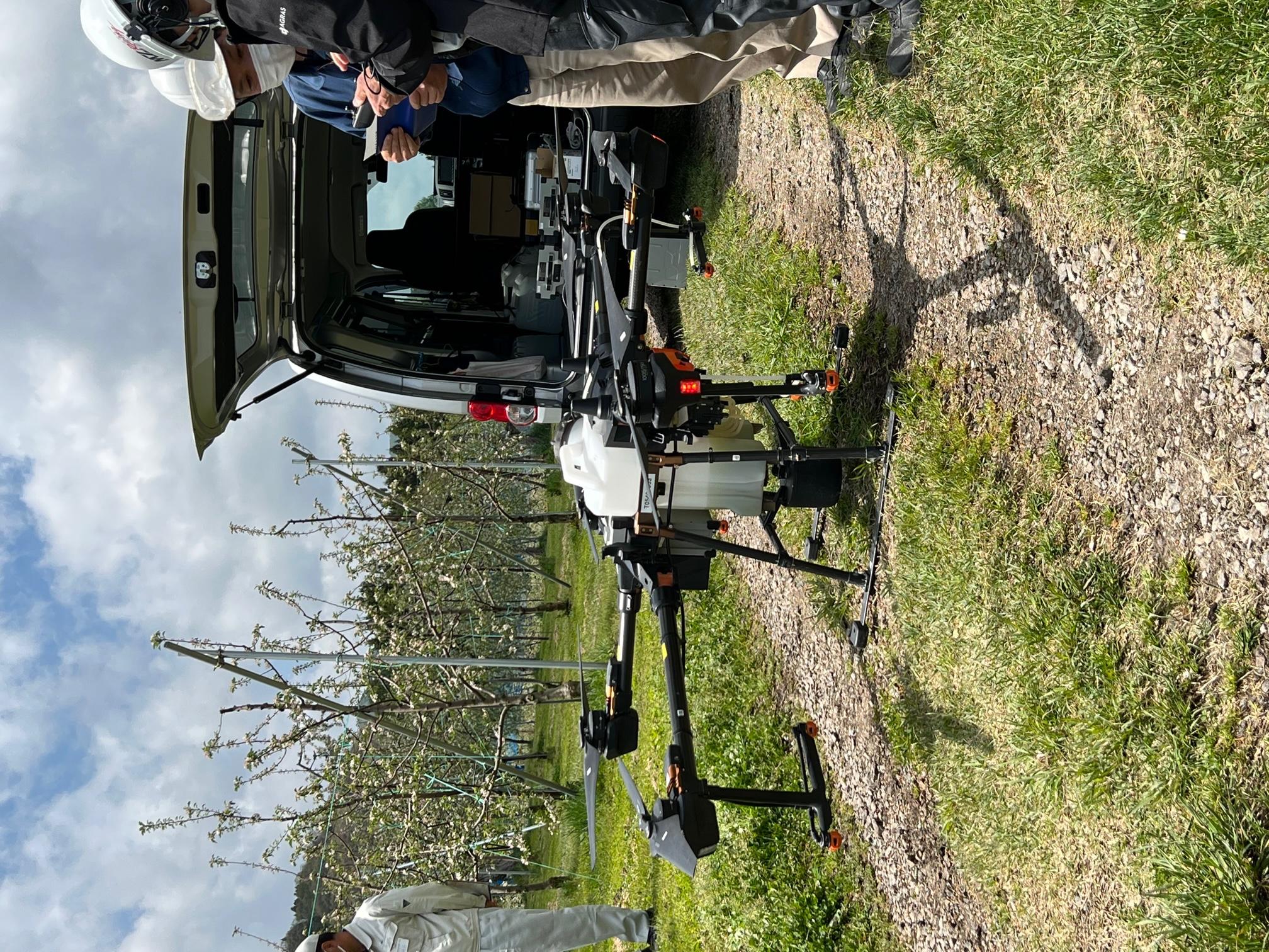 先々月5月に、ドローンでリンゴの受粉を行われることを知り見学に行きました。通常手作業で延べ48時間かかる受粉作業を、ドローン散布は2時間で受粉作業を終わらせました。(当日は風が強くて通常2回の飛行散布を、無駄に飛び散る受粉液のことを考慮し5回飛行散布されました。)要所要所にマーカーを設置し散布状態を確認できるようになっていました。ちなみに、散布用のドローン 一式で250万円だそうです。(請負業者さんのドローンで、農家さん個人の所有ではありませんでした。)ドローンが大型なので、UFOの飛来に人々が遠巻きに驚いているような様子でした。