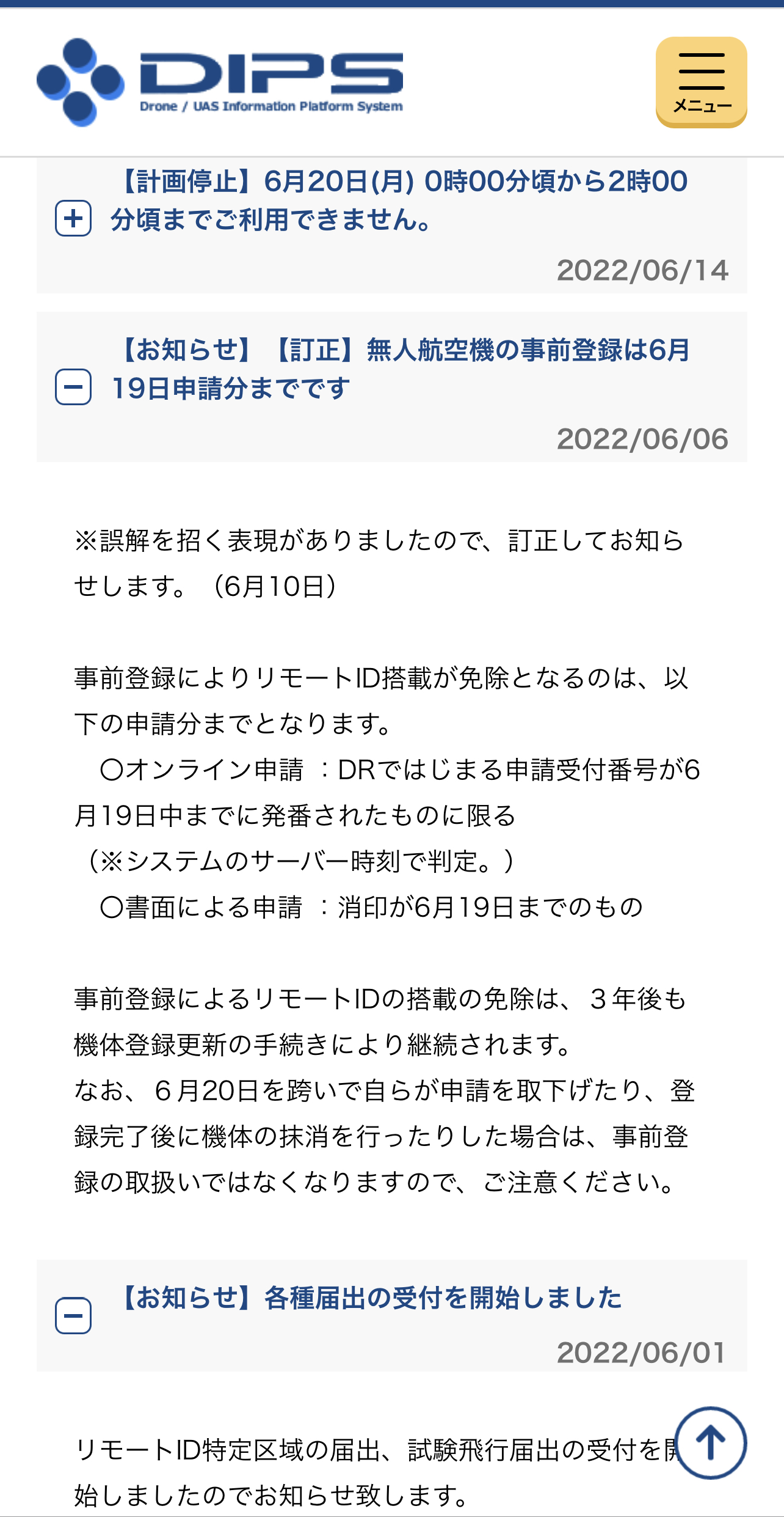 なお、6月20日を跨いで自らが申請を取下げたり、登録完了後に機体の抹消を行ったりした場合は、事前登録の取扱いではなくなりますので、ご注意ください。