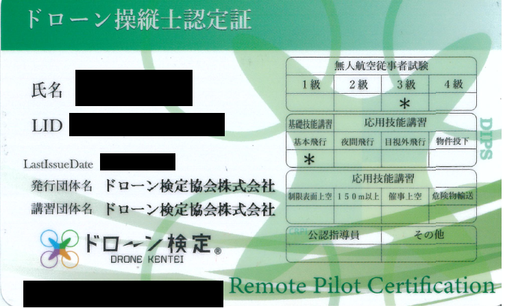 4月にドローン教習所で、基礎操縦技能講習と応用操縦技能講習を受けて合格しました。