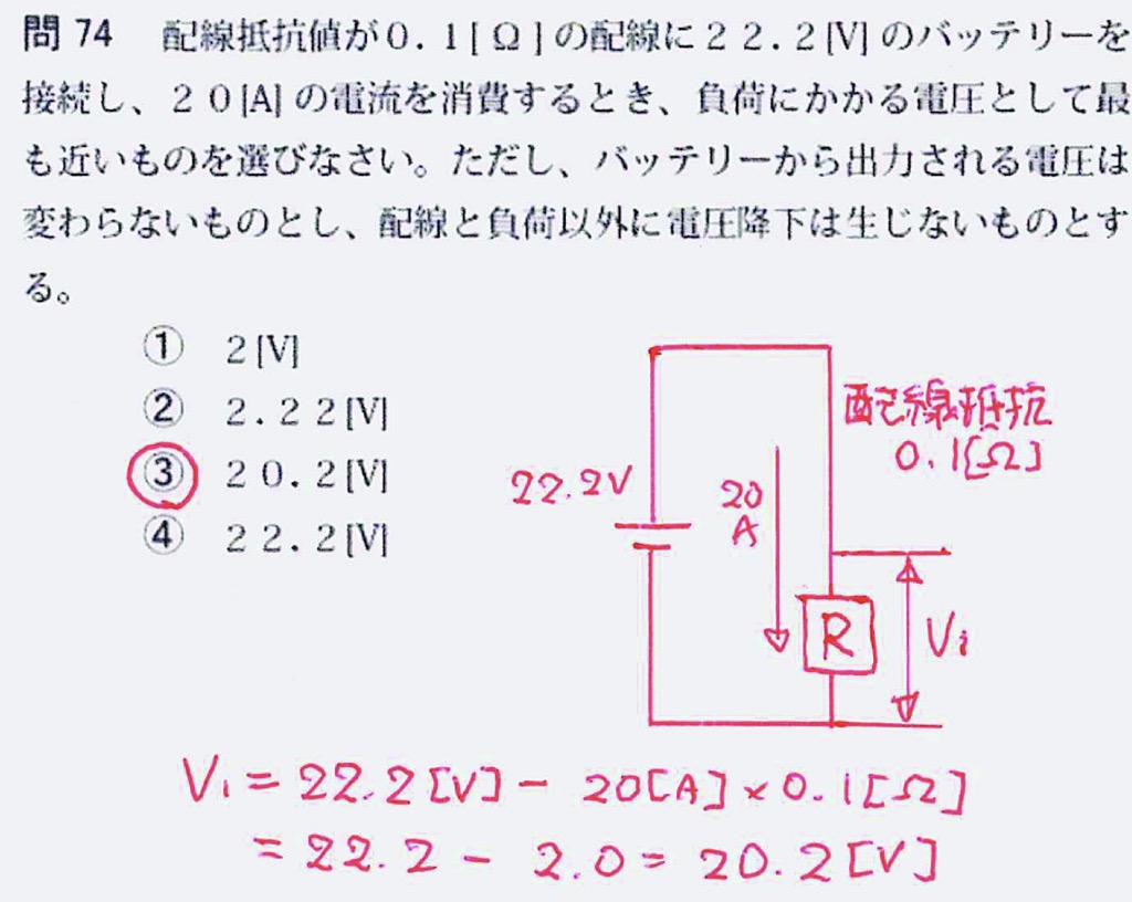 したがって、負荷にかかる電圧は、22.2[V]-2[V]=20.2[V]と③になります。