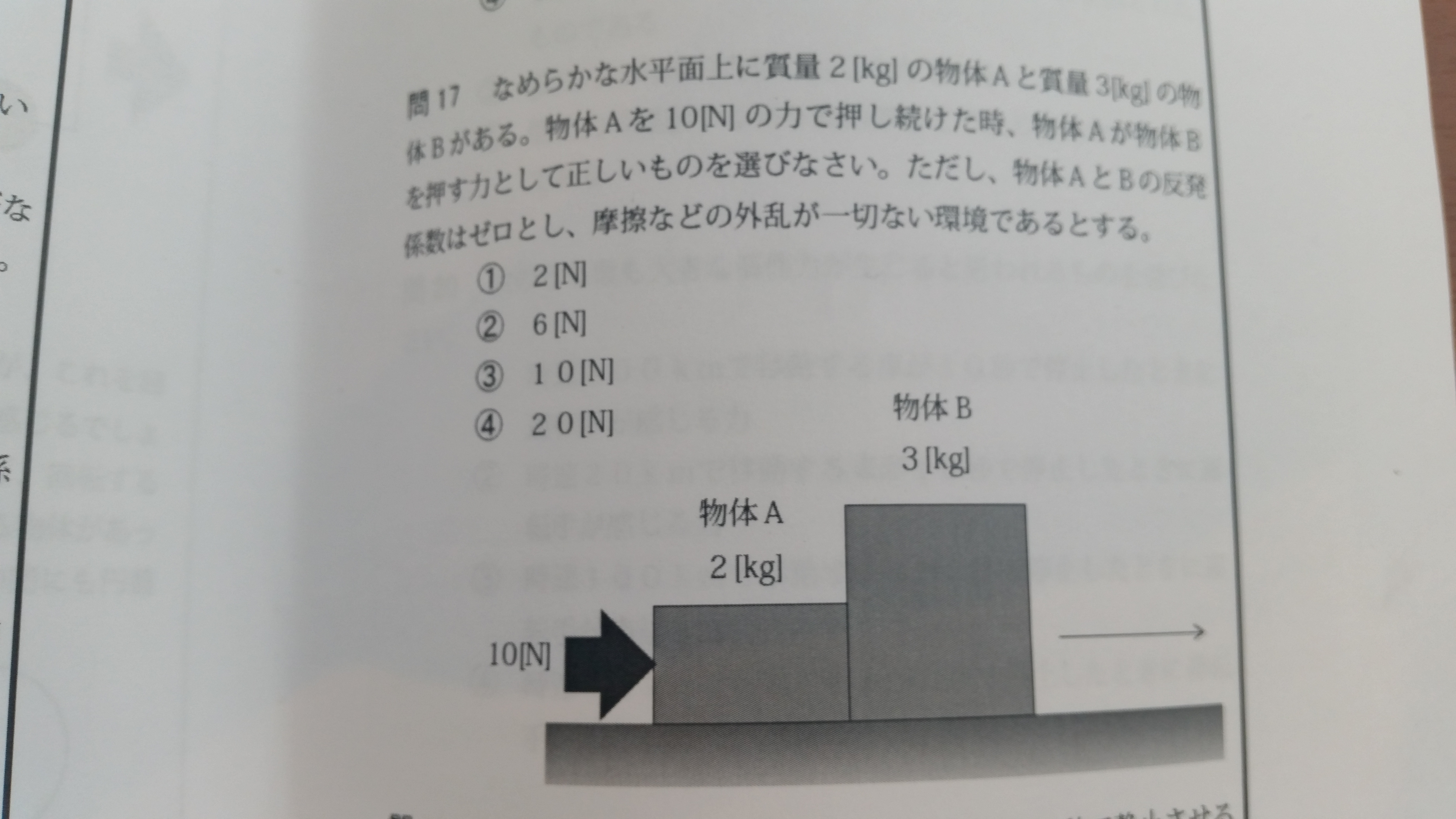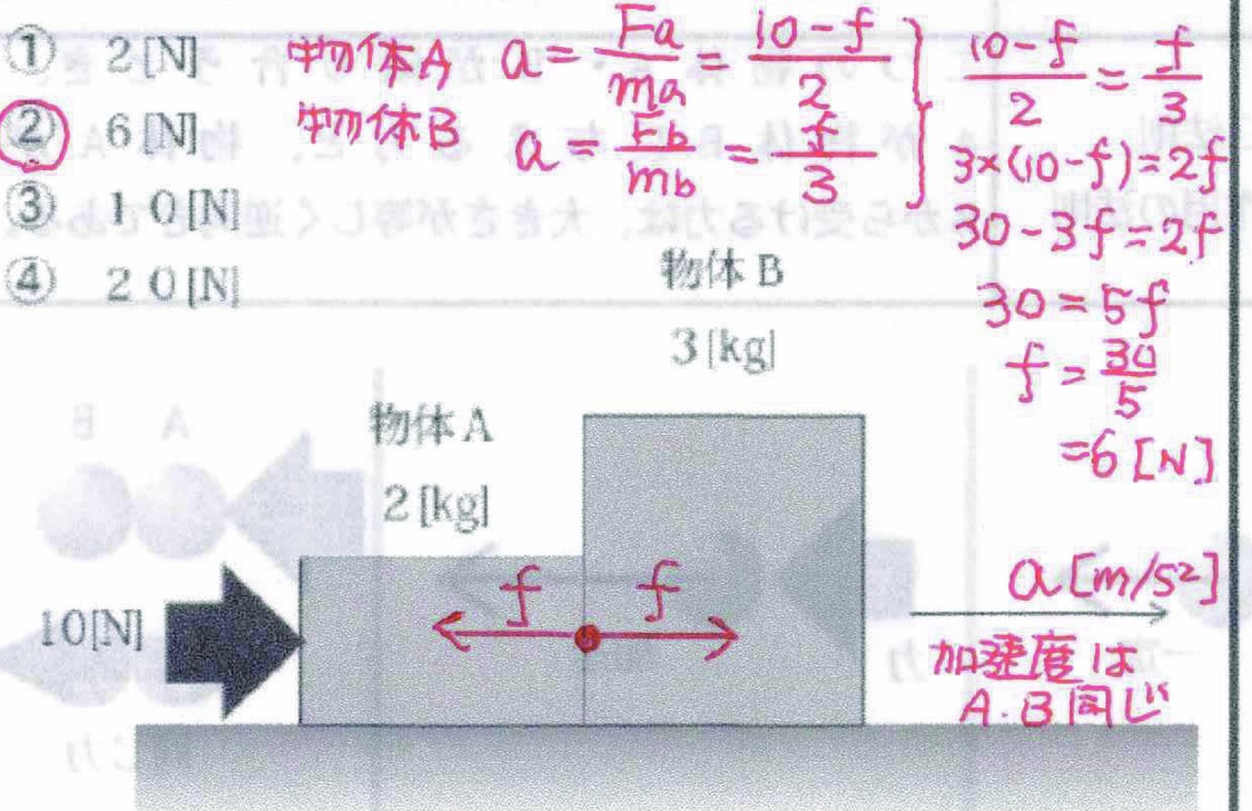 まず、5[Kg]の物体を10[N]で押すと加速度aは、2[m/s2]となる。