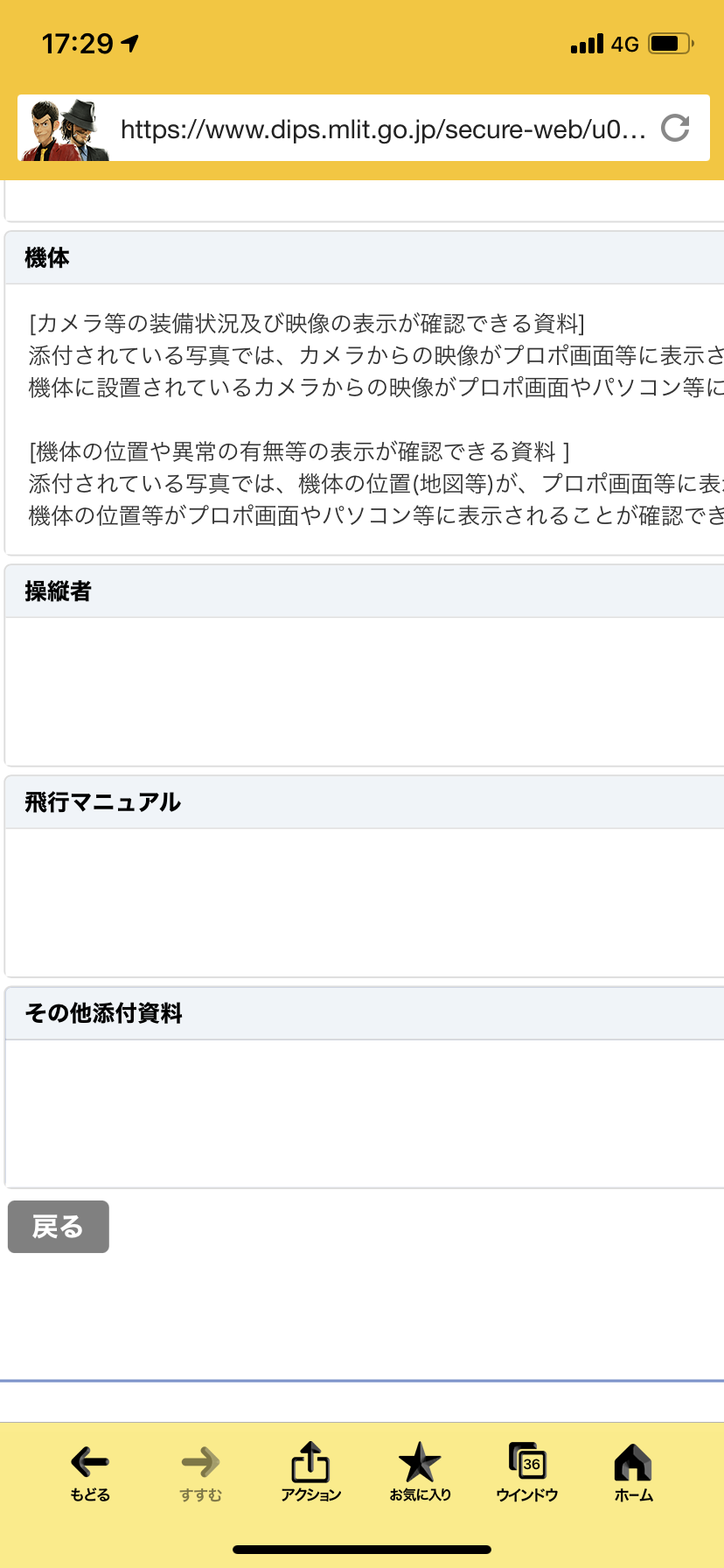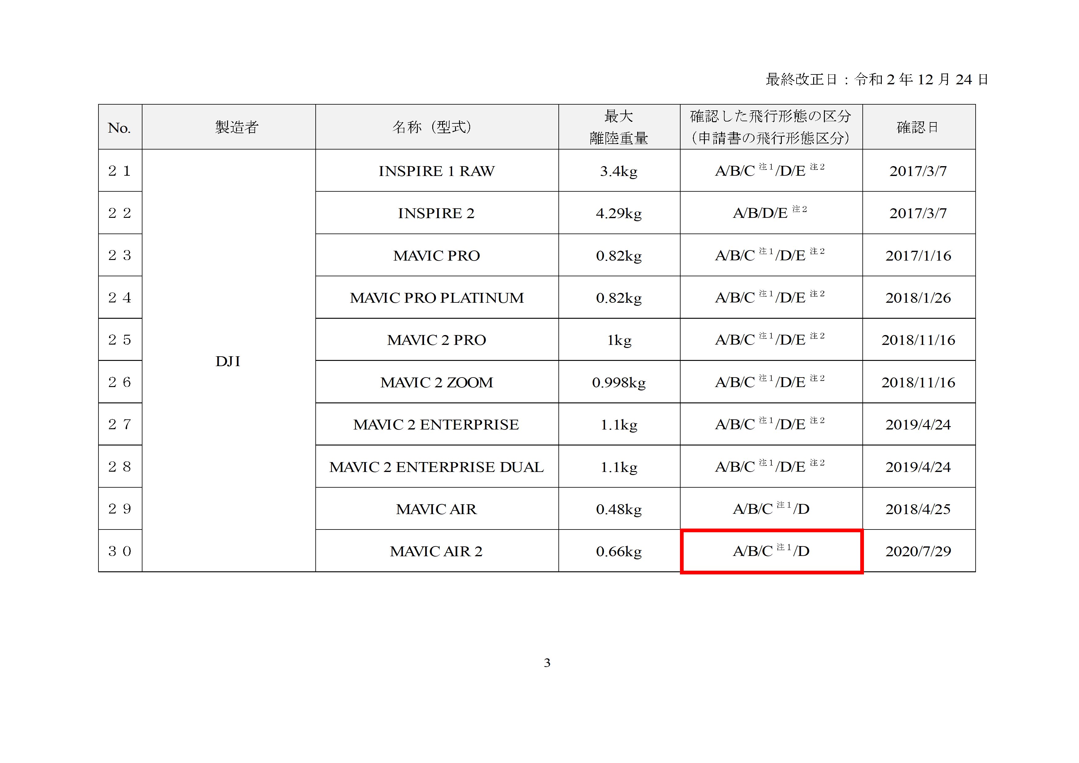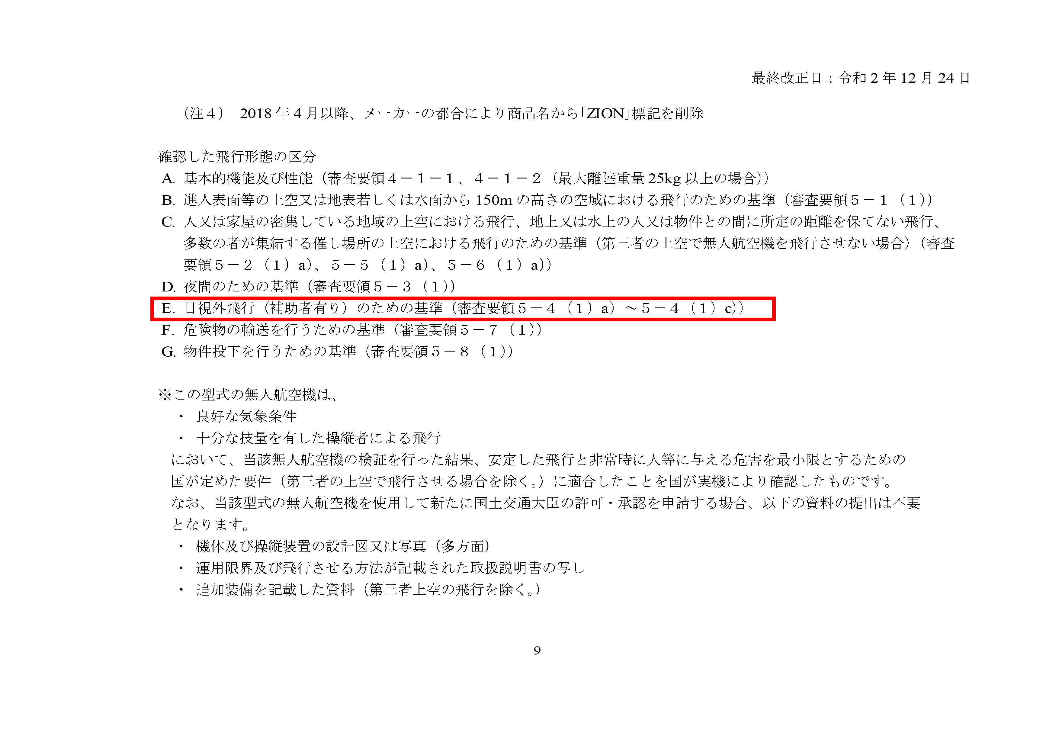 また、申請時の無人航空機の追加基準への適合性の頁の基準の欄の「自動操縦システムを装備し、機体に設置されたカメラ等により機体の外の様子を監視できること。」に対しては「メーカー指定の自動操縦システム及び純正のカメラを装備している。」との記載になっています。