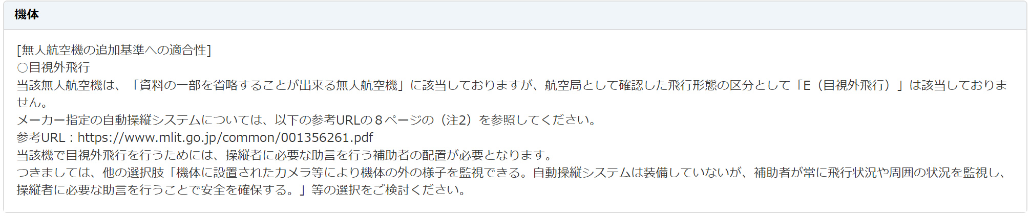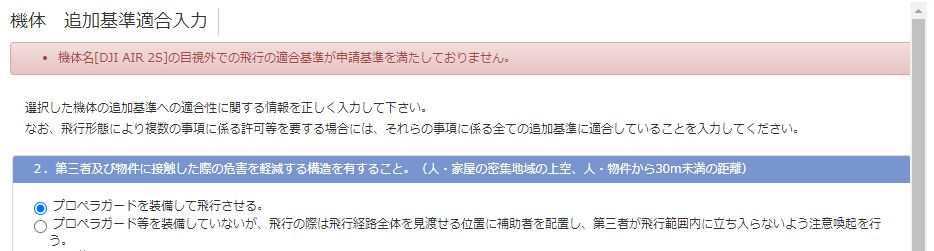 機体 追加基準適合入力時、機体名[DJI AIR 2S]の目視外での飛行の適合基準が申請基準を満たしておりません。。と出て先に進めません。変更申請で目視外での飛行の適合基準の修正は何処にあり、修正できるのか?ヘルプデスクには繋がらず。目視外・DIDのチェックを外せば通りますが、これでは何処も飛ばせません。どうしたら通るのでしょうか。よろしくお願いします。