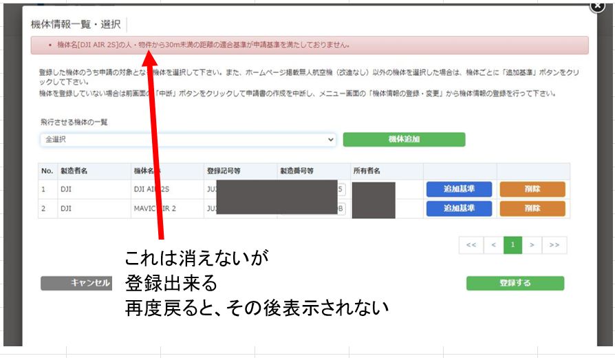 参考にさせて頂き、入力を進めていたところヘルプデスクよりTELが入り、本件でお尋ねしたところ、機体 追加基準適合入力画面で全ての入力が正しく、機体情報一覧・選択に戻っても【機体 追加基準適合入力時、機体名[DJI AIR 2S]の目視外での飛行の適合基準が申請基準を満たしておりません。】の文字はシステム上【消えない】との事。(ここで再度、機体 追加基準適合入力へ戻り、と、堂々巡りでしたのですが)、そもまま登録ボタンを押すと、申請書作成(3/4)機体・操縦者選択画面にもろることが出来、無事に申請へと進めました。